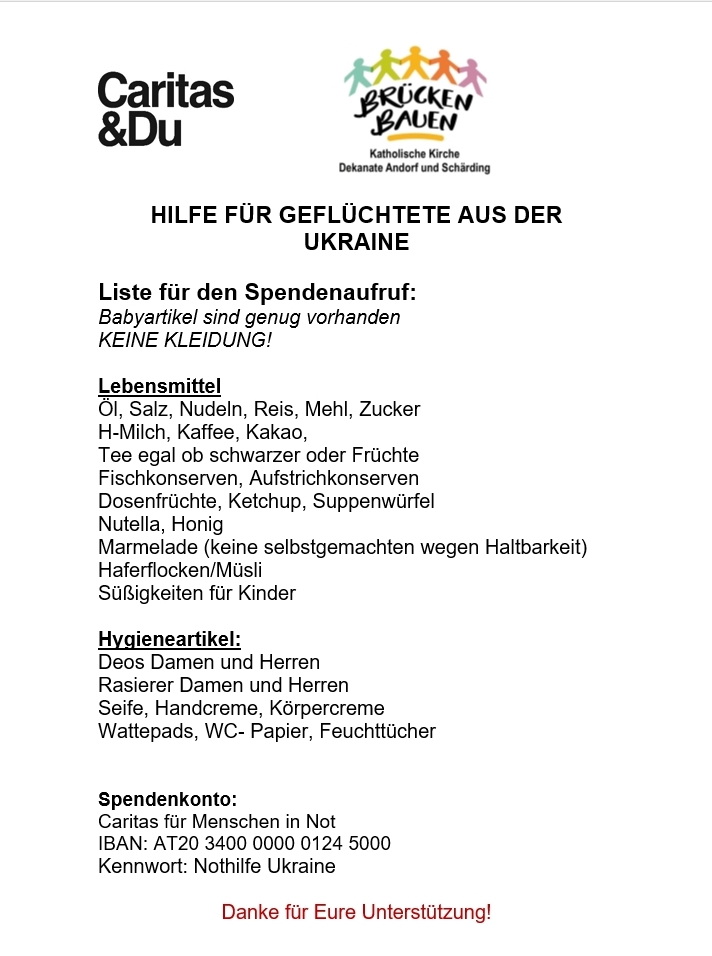 Regionalcaritas und "Brücken bauen" organisieren dazu in den Dekanaten Andorf und Schärding eine Sachspendensammlung.