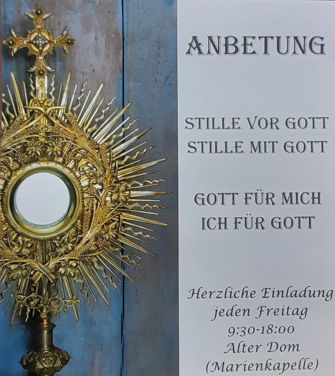 Jeden Freitag laden wir im Alten Dom in der Zeit von 09:30 Uhr bis 18:00 Uhr zur eucharistischen Anbetung in der Marienkapelle ein.
